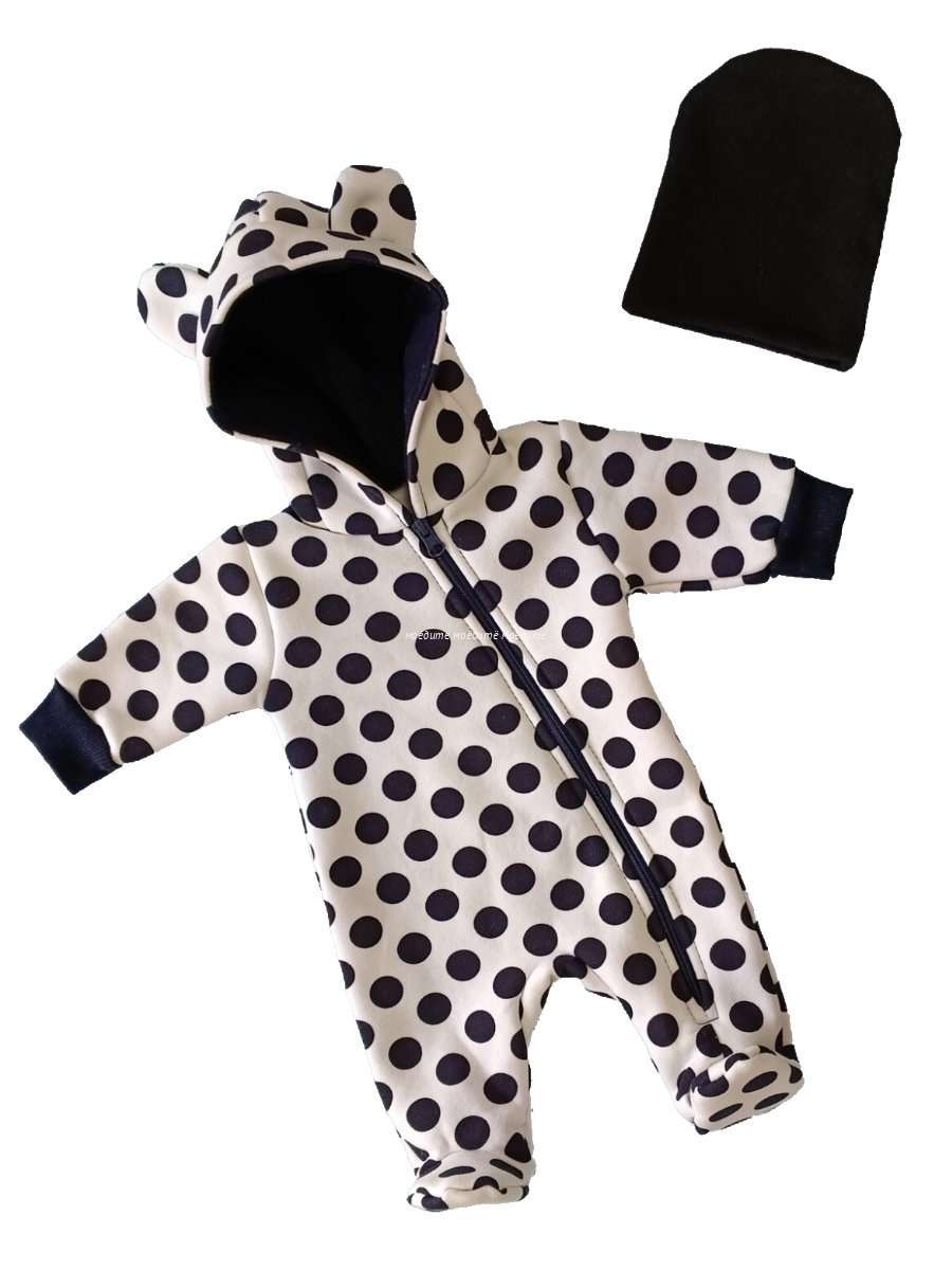 "МоёДитё" комбинезон выполнен из футера с начёсом. Комбинезон с капюшоном на подкладке и декорирован сверху ушками, с закрытыми ножками, рукава на манжетах, спереди косая молния до конца одной ножки. Шапочка из кашкорсе можно одевать как с отворотом, так и без. Очень хорошо тянется.